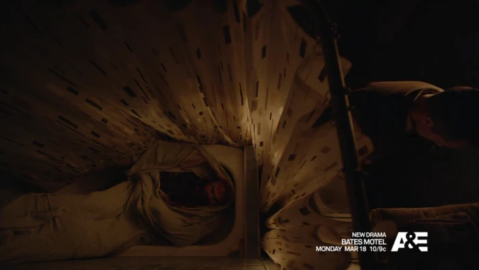 They wipe down the kitchen, carry the wrapped up body into one of the motel rooms and hide it in the bathtub. Part of the rug was stained with blood in the process, so they're forced to pull up the rugs from several of the rooms, under one of which Norman finds a strange sketchbook. The sheriff Alex Romero and his deputy Zack Shelby arrive at the motel, and Norma and her son act like everything's fine. Not convinced, the sheriff asks if he can take a look inside one of the rooms, then if he can use the bathroom, in the tub of which is the dead body. Even after Norma tries telling him the toilet's not functional, he uses it anyway, saying you just have to jiggle the chain. He never notices the body behind the shower curtain, and the two policeman leave.