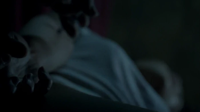 In a dark room, a young woman is chained to the floor, and someone walks in and injects her.