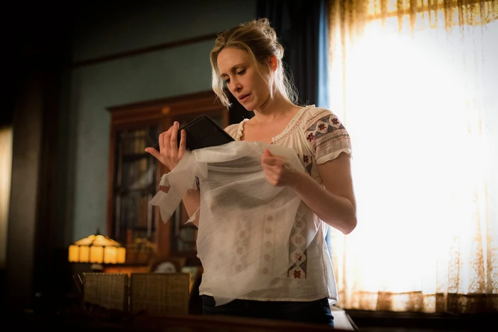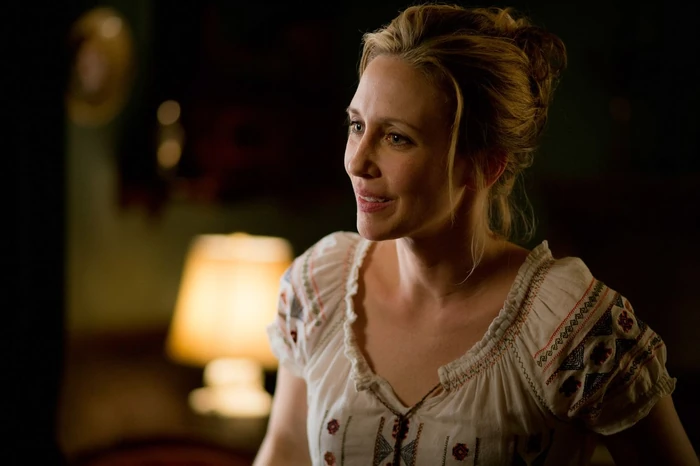 Vera Farmiga prepares for the stabbing scene.